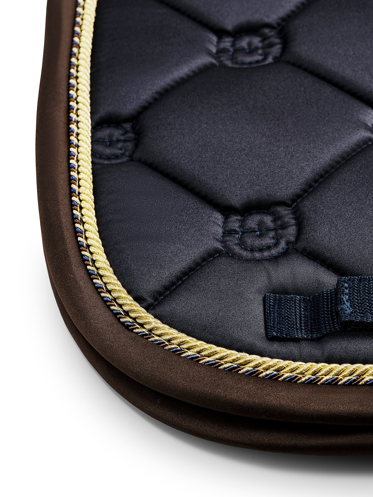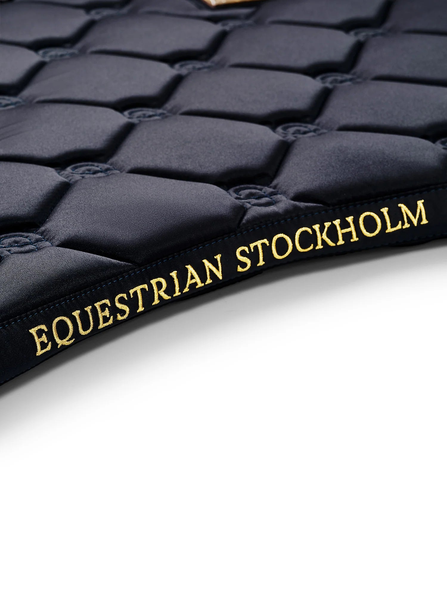 Die hochwertige Dressurschabracke in Shiny Navy ist ideal für das Training. Das Material der Schabracke ist glänzend und schmutzabweisend und hat schöne goldfarbene Details und ein Muster mit dem Logo von Equestrian Stockholm.