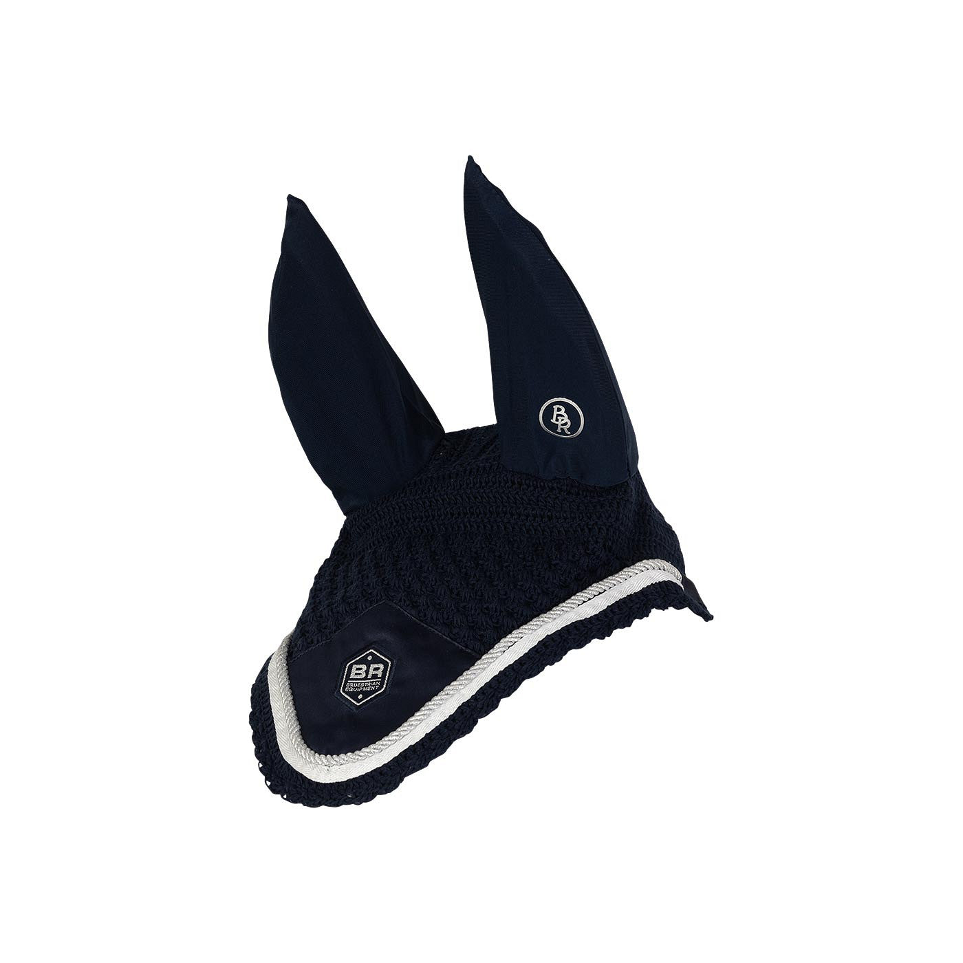 Dank des glatten, dehnbaren Lycra-Materials liegen die Ohren perfekt um die Ohren des Pferdes. Die Ohrenhaube ist im gleichen Stil wie die Schabracken mit einem Satineinsatz, einer dezent glänzenden Paspel mit Fischgrätmuster und einer silbernen Kordelpaspel veredelt.