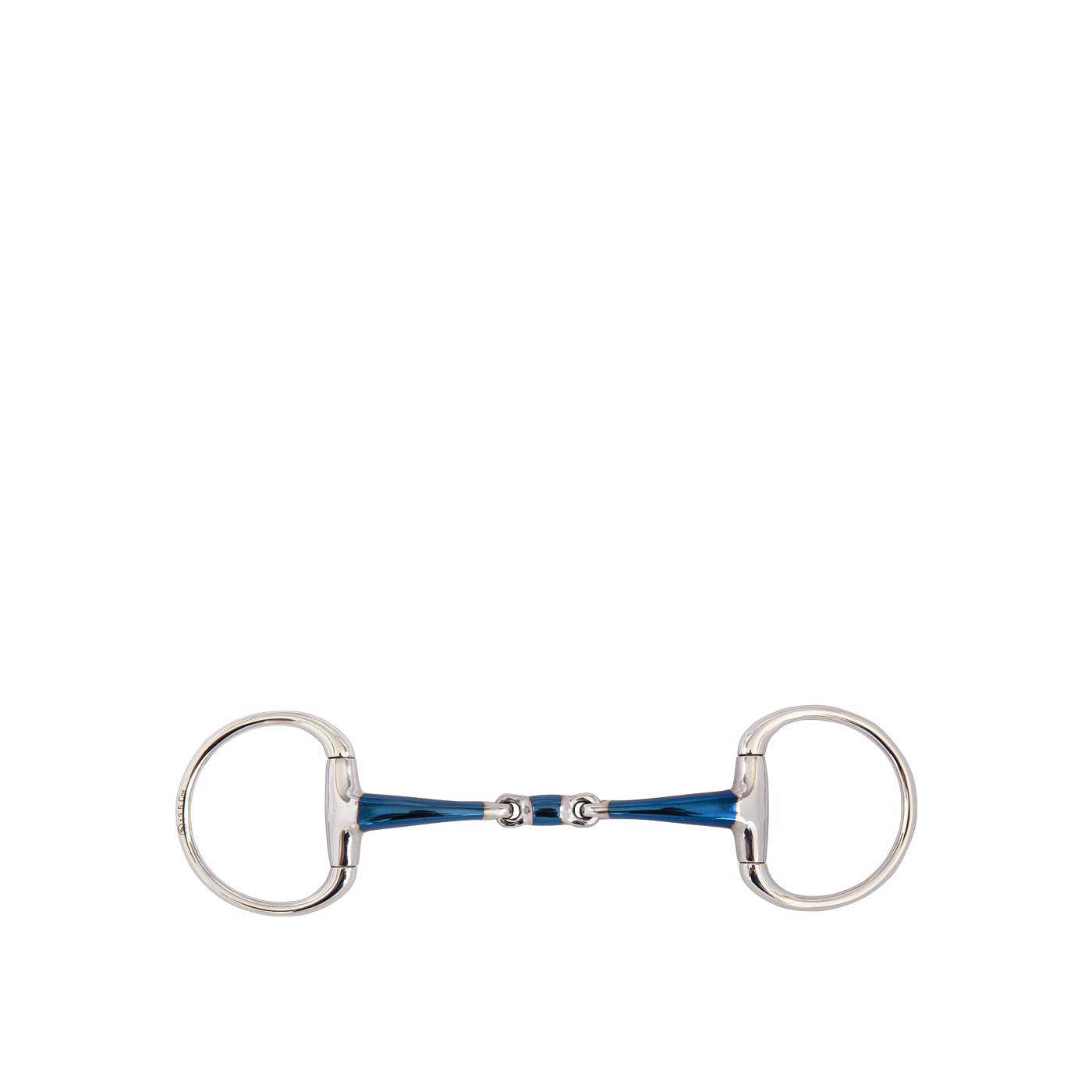 Die Sweet Iron Gebisse sind dafür bekannt, dass die Mundstücke einen süßen Geschmack haben. Die Gebisse sind anatomisch geformt und es gibt sie in vielen Arten und Größen. Diese doppelt gebrochene Olivenkopftrense enthält Ringe aus massivem Edelstahl und ein Mundstück aus Baustahl kombiniert mit einer Sweet-Iron-Schicht auf dem Mundstück (blau). Die Speichelproduktion wird noch zusätzlich gefördert durch die Sweet-Iron-Schicht auf dem Mundstück. Wenn dieses Material reagiert mit Feuchtigkeit, Wärme und Luft wird es oxidieren und einen süß schmeckenden Oberflächenrost entwickeln. Dies hilft bei der Akzeptanz des Gebisses. Letztendlich verschwindet die blaue Farbe, aber der Geschmack des Oberflächenrostes bleibt. Die anatomische Form folgt der Form des Pferdemauls, was eine sanfte und gleichmäßige Druckverteilung ermöglicht. Das Magic System kombiniert die Flexibilität eines gebrochenen Gebisses mit der Kontrolle einer Gebiss-Stange. Das Exklusive Design beugt, dank der Blockierfunktion, Verletzungen an der Zunge und am Gaumen vor. Bei einem doppelt gebrochenen Gebiss besteht das Mundstück aus drei Teilen, der mittlere Teil liegt dabei flach auf der Zunge. Dadurch entsteht mehr Druck auf die Zunge als bei einem einfach gebrochenen Mundstück. Je stärker das Mittelstück ist, desto mehr Druck wird auf die Zunge ausgeübt. Das Mundstück ist 14 mm stark und die Gebissringe haben einen Durchmesser von 65 mm. Eine Olivenkopftrense hat Ringe, die sich nicht frei drehen können. Dadurch wirken Hilfen direkter. Dieser Gebisstyp wird im Allgemeinen gut angenommen, weil das Mundstück relativ fest im Maul liegt.