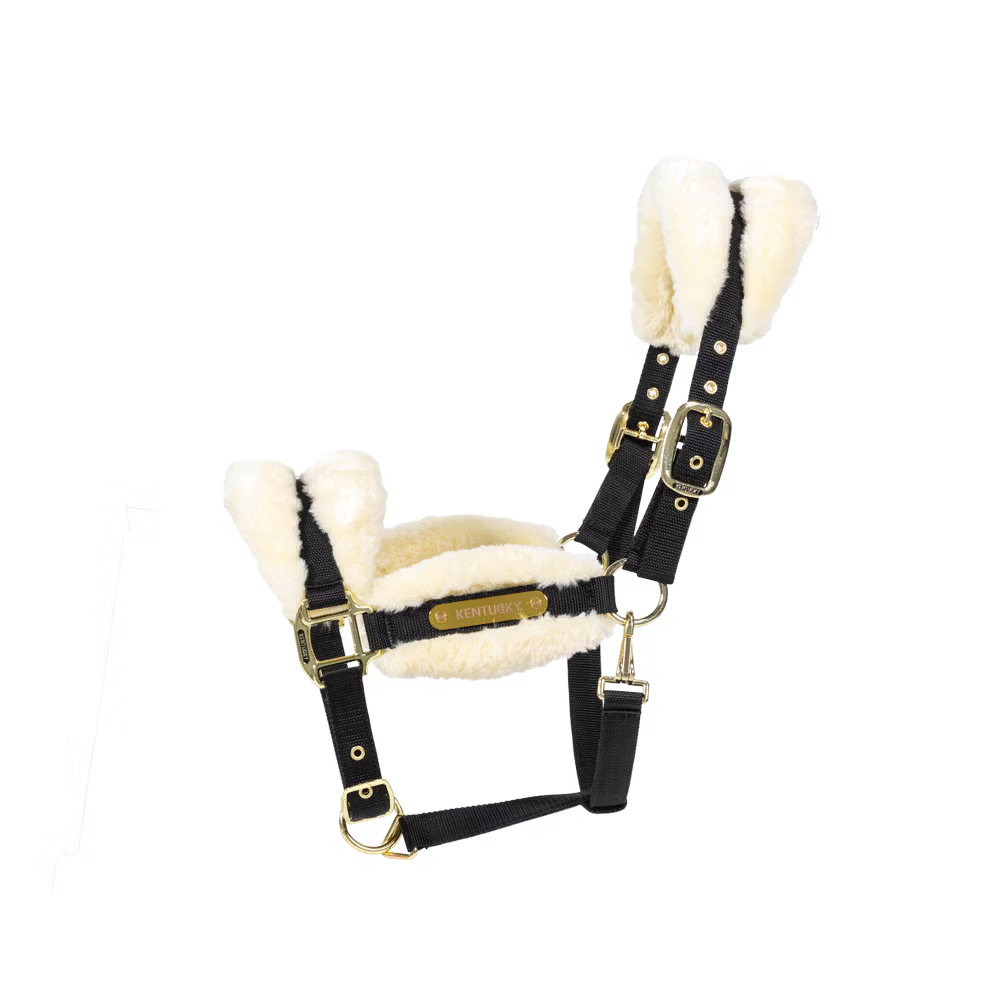 Das Halfter ist aus Nylon gefertigt. An der Nase, hinter den Ohren und im Backenbereich ist künstliches Lammfell auf das Nylon aufgenäht. Das Halfter besticht mit einer goldfarbenen Plakette, auf dem unser Logo eingraviert ist. Diese Plakette kann umgedreht und mit dem Namen Ihres Pferdes graviert werden. Alle Schließen sind goldfarben und passen so auch perfekt zu unseren Führstricken.