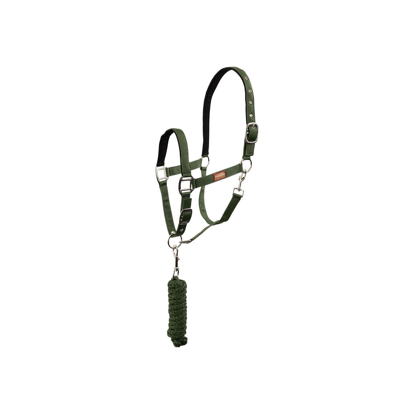 Dieses praktische Halfter ist an Genickstück und Nasenriemen mit weichem Nubukleder für optimalen Komfort gefüttert. Zusätzlich lässt sich das Halfter am Nasenriemen und an beiden Seiten des Genickstücks für den richtigen Sitz verstellen. Das Set ist mit einem Karabinerhaken ausgestattet.