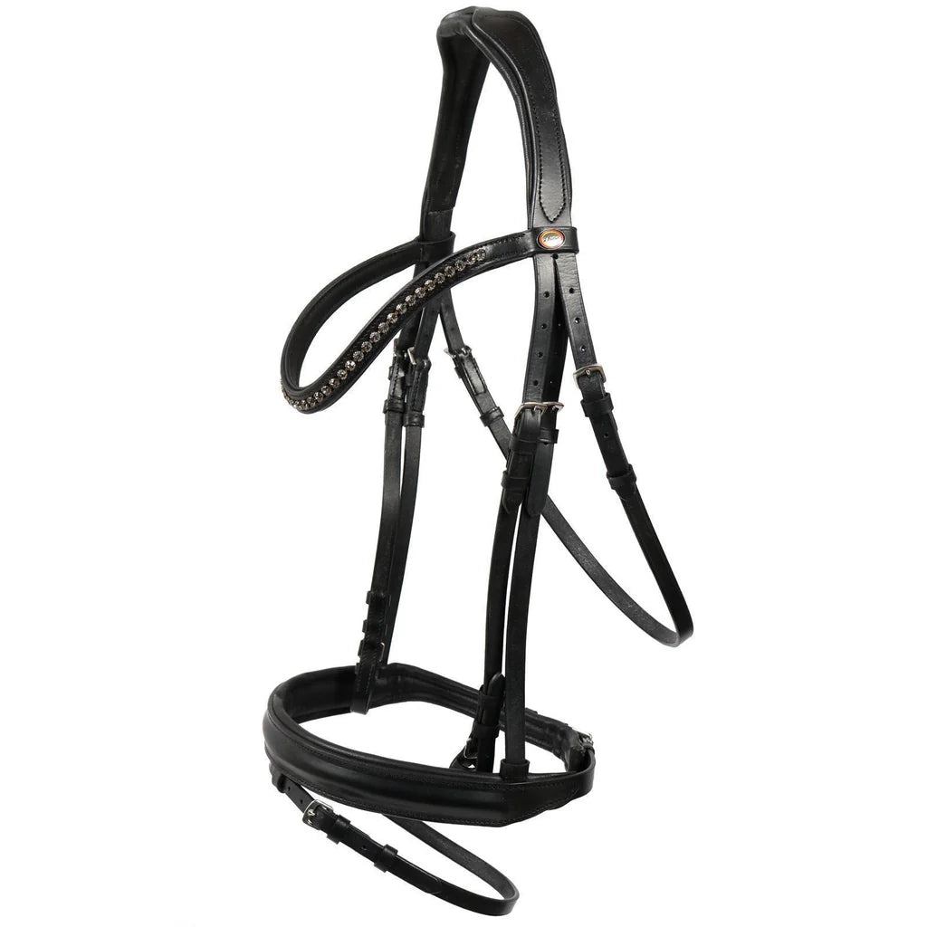 Die Trense Luhmühlen passt zu jedem Pferdetyp und allen Disziplinen. Das Alleinstellungsmerkmal ist das Genickstück mit neuer Passform. Dies ist besonders weich und genickschonend. Die Pferde Trense gibt es mit einem englischen Reithalfter in den Farben Schwarz/Silber. Auf dem Stirnband befinden sich silbergraue Kristall-Strass-Steine.