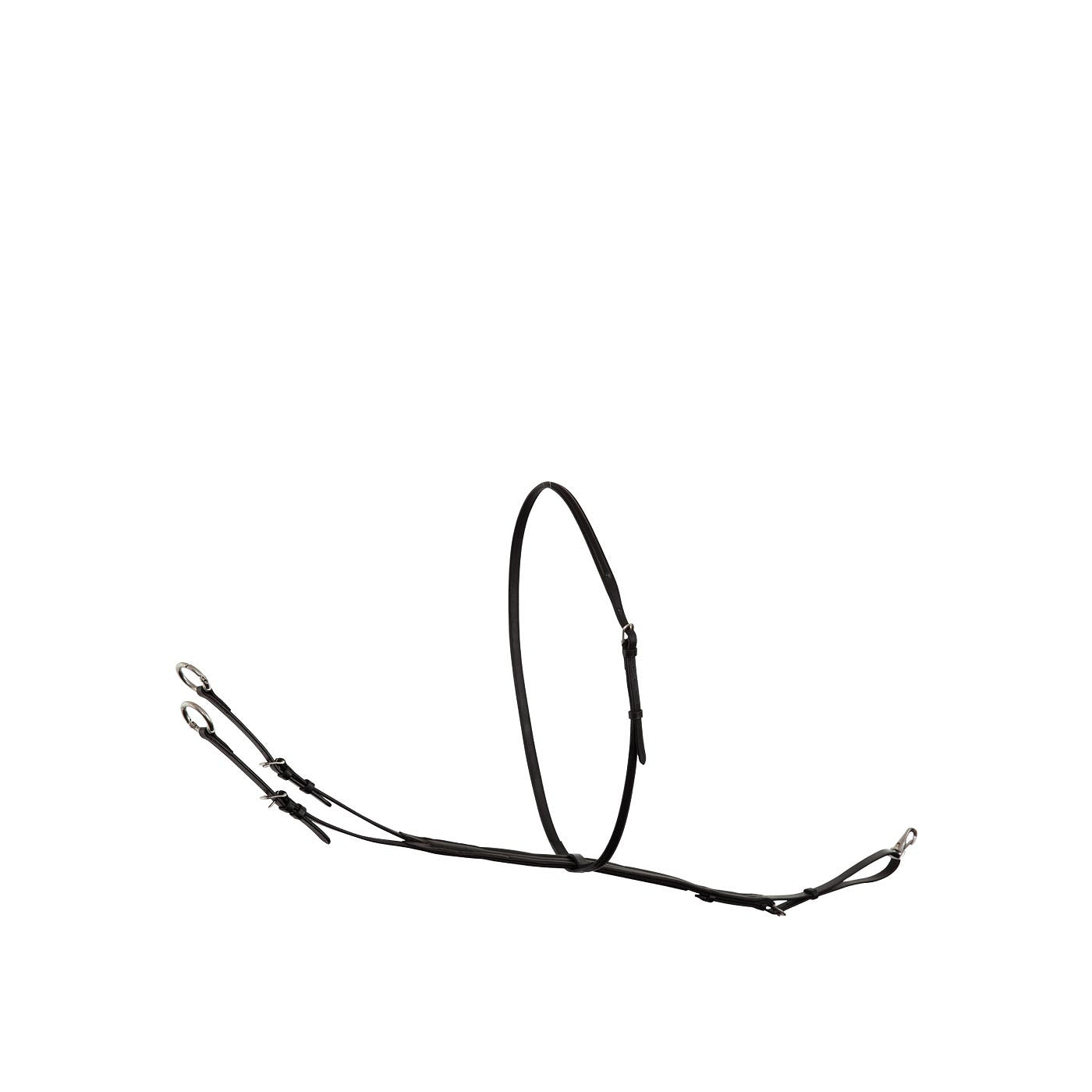 Ledermartingal mit versilberten Messingschnallen. Das Martingal, das in der Regel beim Springen verwendet wird, verhindert das Pferd den Kopf über ein vorgegebene Maß zu heben. Außerdem sorgt das Martingal für einen Winkel in den Zügeln, wenn das Pferd trotzdem den Kopf hebt. Dadurch kann das Gebiss abwärts einwirken auf die Laden statt auf die weniger empfindlichen Maulwinkel. für besonderen Komfort ist das Martingal weich gefüttert, zudem sind die Zügelringe mit speziellen Clips versehen. Diese runden Clips öffnen sich nach innen und erleichtern es, Zügel festzumachen oder zu entfernen, ohne dass die Gefahr besteht, dass sich die Zügel zu unerwünschten Zeitpunkten lösen. Aus europäischem Leder. Mit Martingalstoppern aus Gummi.