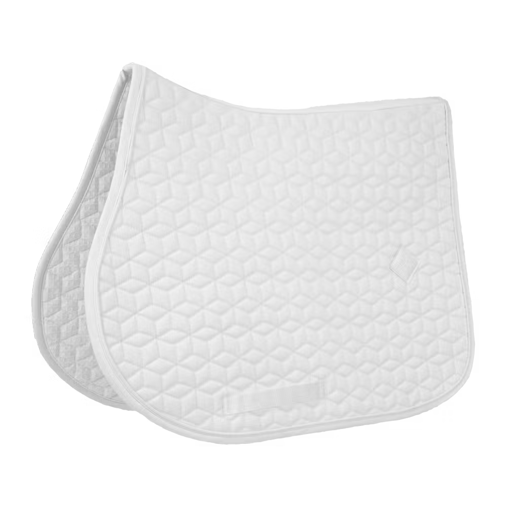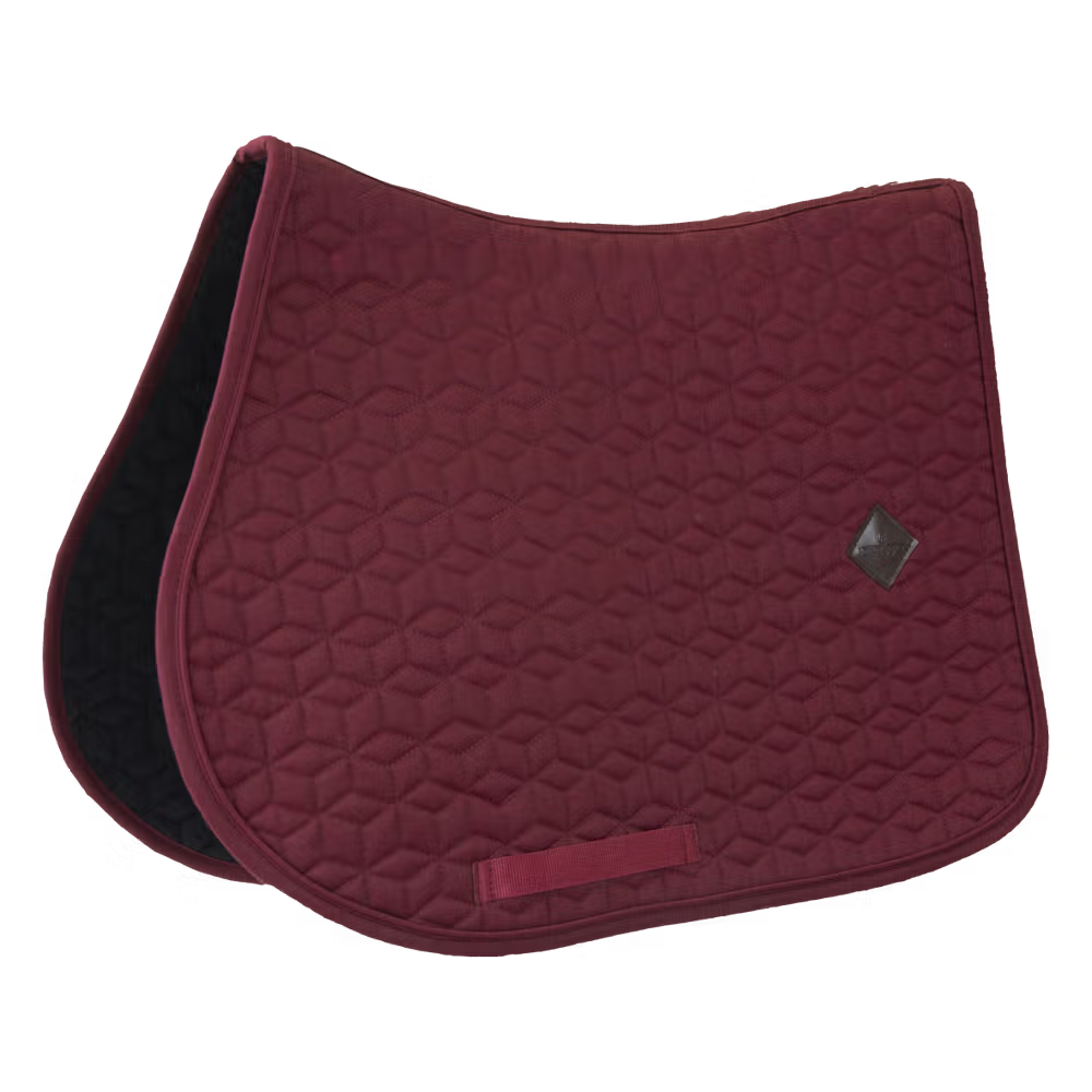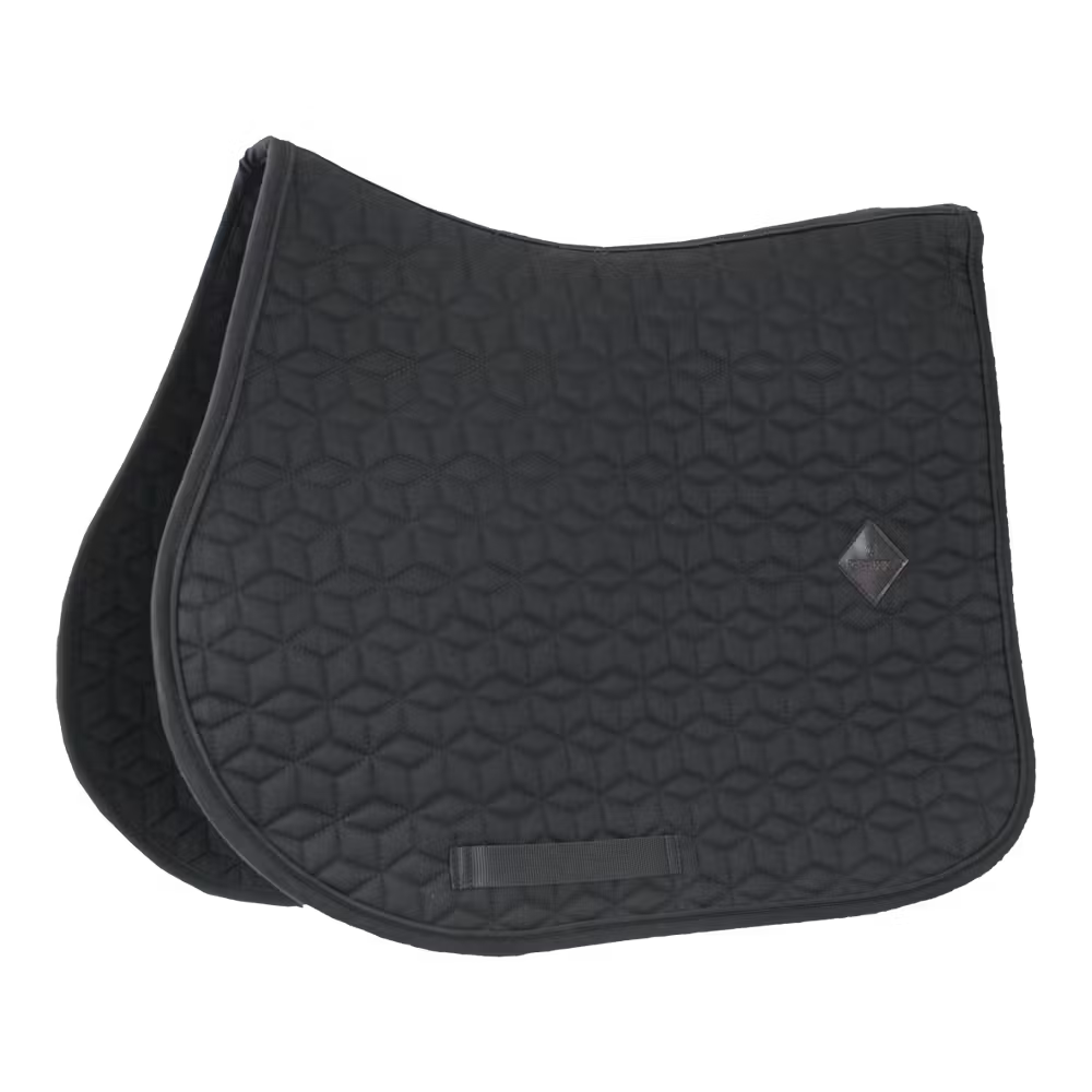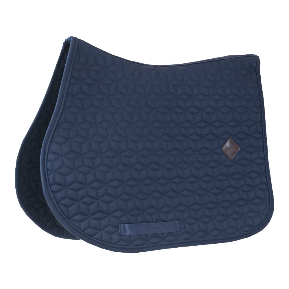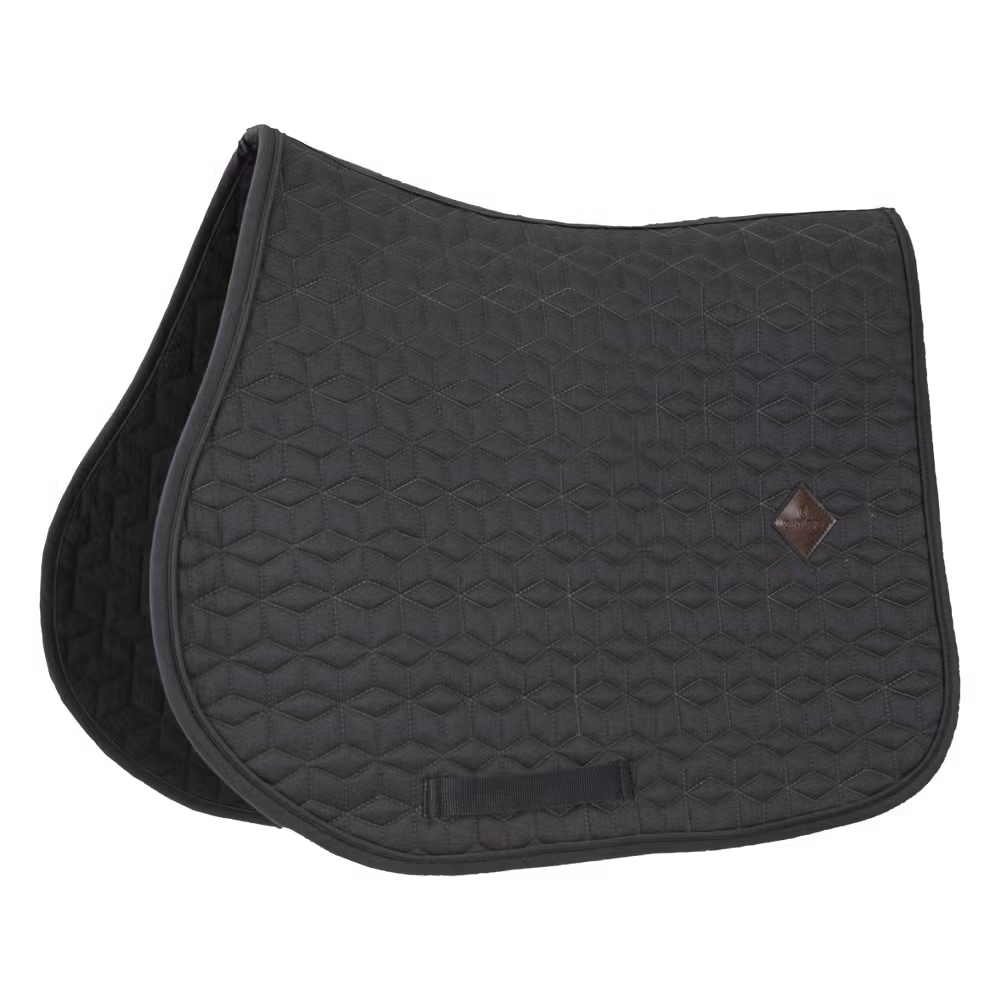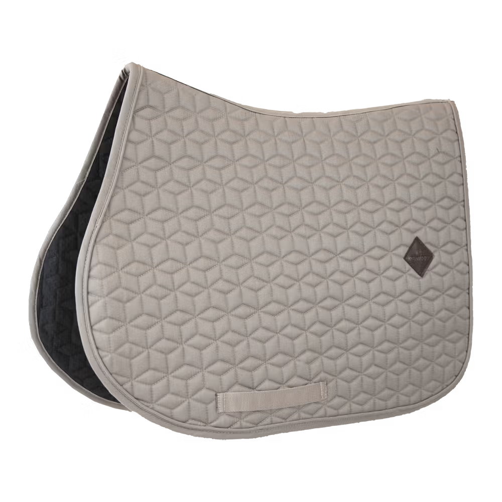 Die Außenseite der Schabracke besteht aus einem baumwollähnlichen Polyester in schicker Würfelsteppung. Auf der linken Seite der Schabracke befindet sich ein kleiner Patch aus veganem Leder mit dem Kentucky-Logo, unter dem Logo ist genug Platz, für eine eigene Bestickung. Das Futter der Schabracke ist ein feuchtigkeitsableitendes Baumwoll-Polyester-Gemisch.