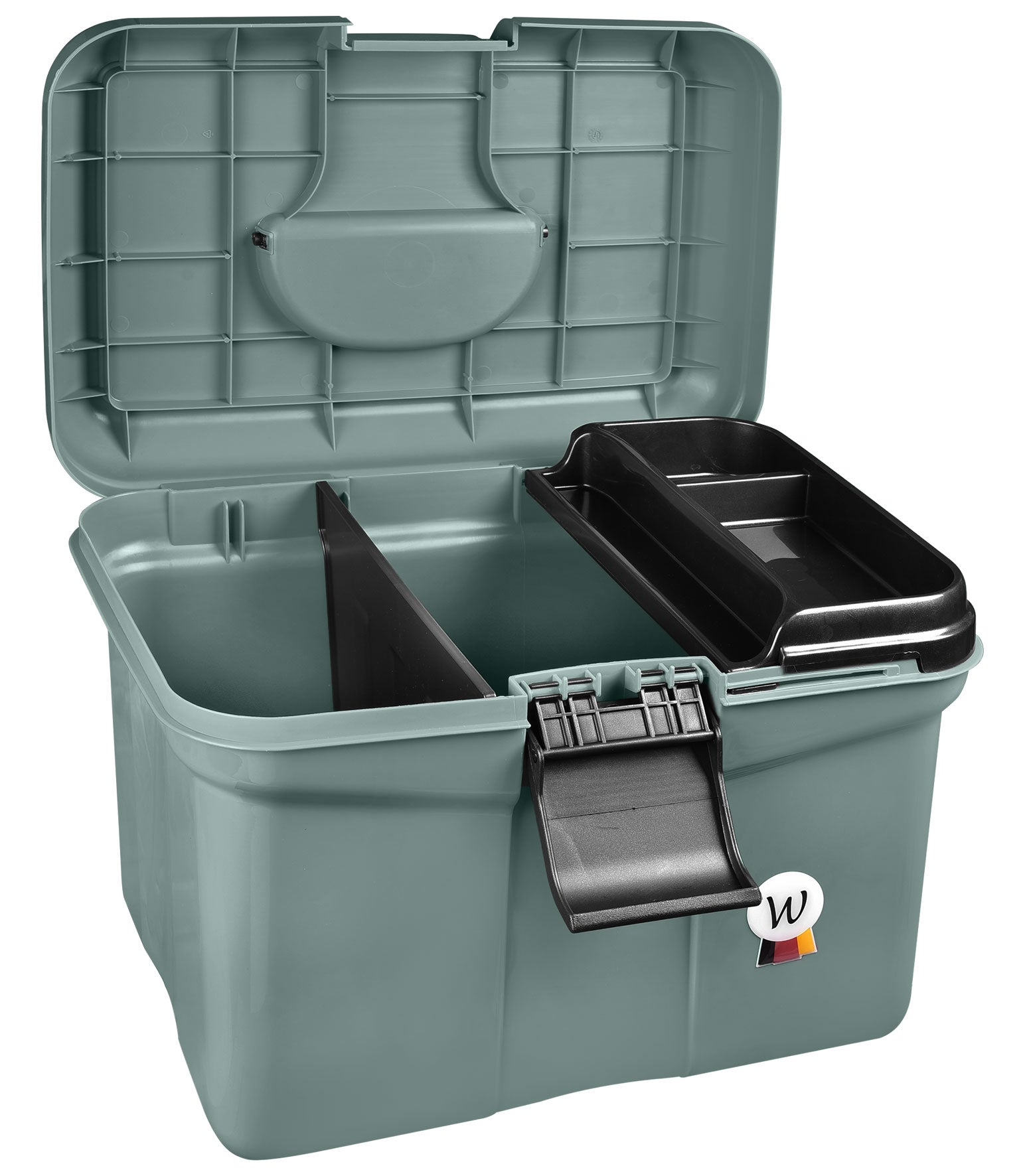 Hochwertige Putzbox aus recyceltem Kunststoff. Der perfekte Begleiter im Stall und auf dem Turnier. Versenkbarer Griff, abschließbarer Schnappverschluss, 2-fach verstellbare Trennwand, ausziehbares Kleinteilefach und das leichte Eigengewicht zeichnen sie aus!'