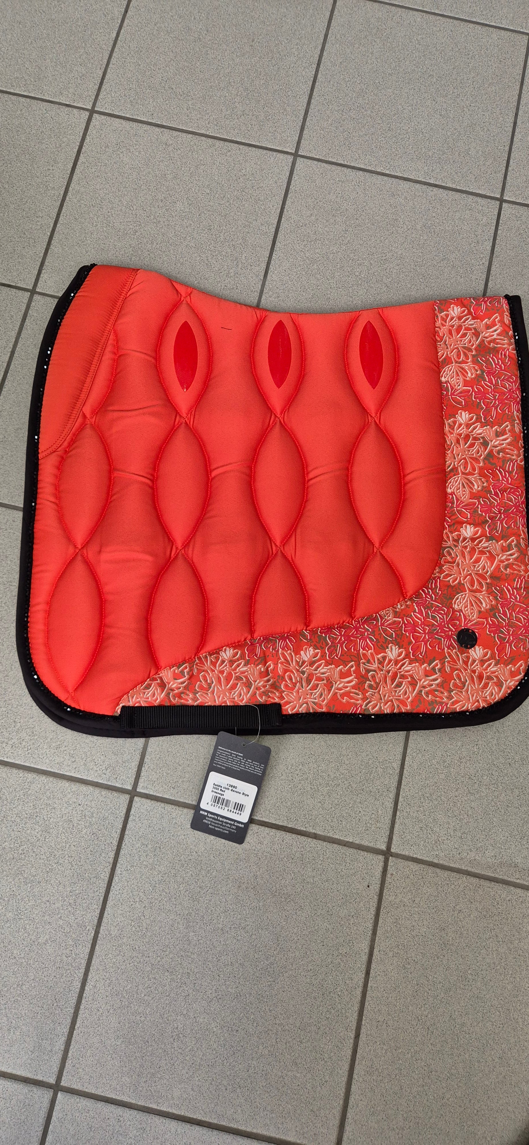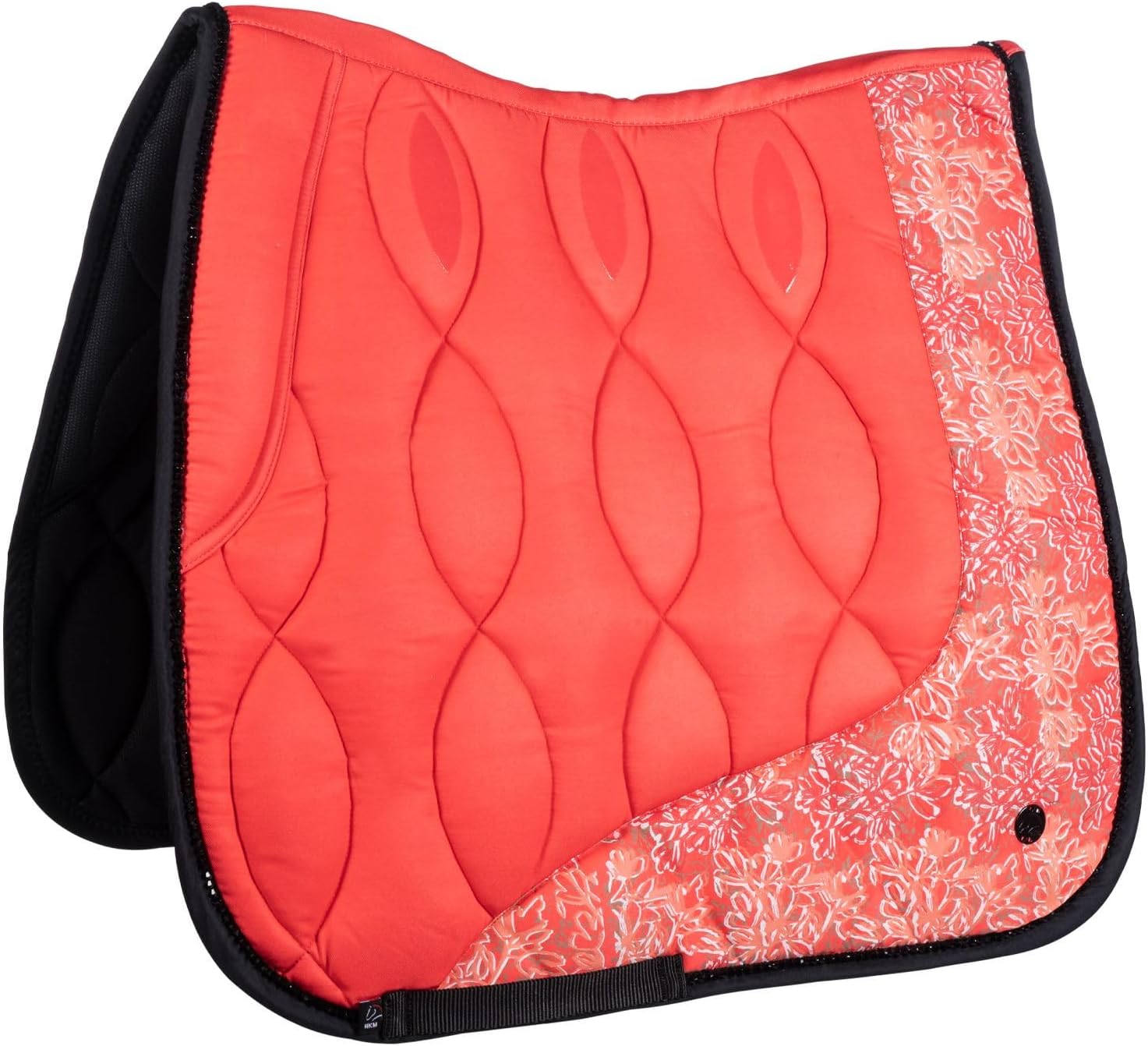 Die Schabracke Savona Style überzeugt durch eine große ovale Steppung und einen großflächigen Mustereinsatz im floralen Look. Zu den Vorteilen der Schabracke zählt die für das Pferd besonders angenehme Schaumstoff- und Wattefüllung sowie die anatomische Form. Der Silikondruck in der Sattellage beugt einem Verrutschen des Sattels vor. Erhältlich in Taupe und Rot mit schwarzer Unterseite und schwarzer Umrandung.