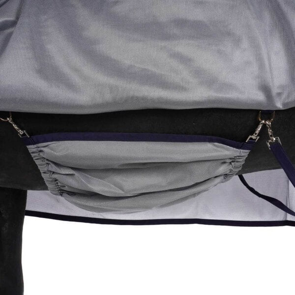 Ausgestattet mit einem elastischen, abnehmbaren Bauchlatz und Beingurten, bietet die Decke sicheren Halt und Komfort. Der integrierte UV-Schutz schützt die Haut deines Pferdes vor schädlichen Sonnenstrahlen, während der Schweifschutz zusätzlichen Komfort bietet.