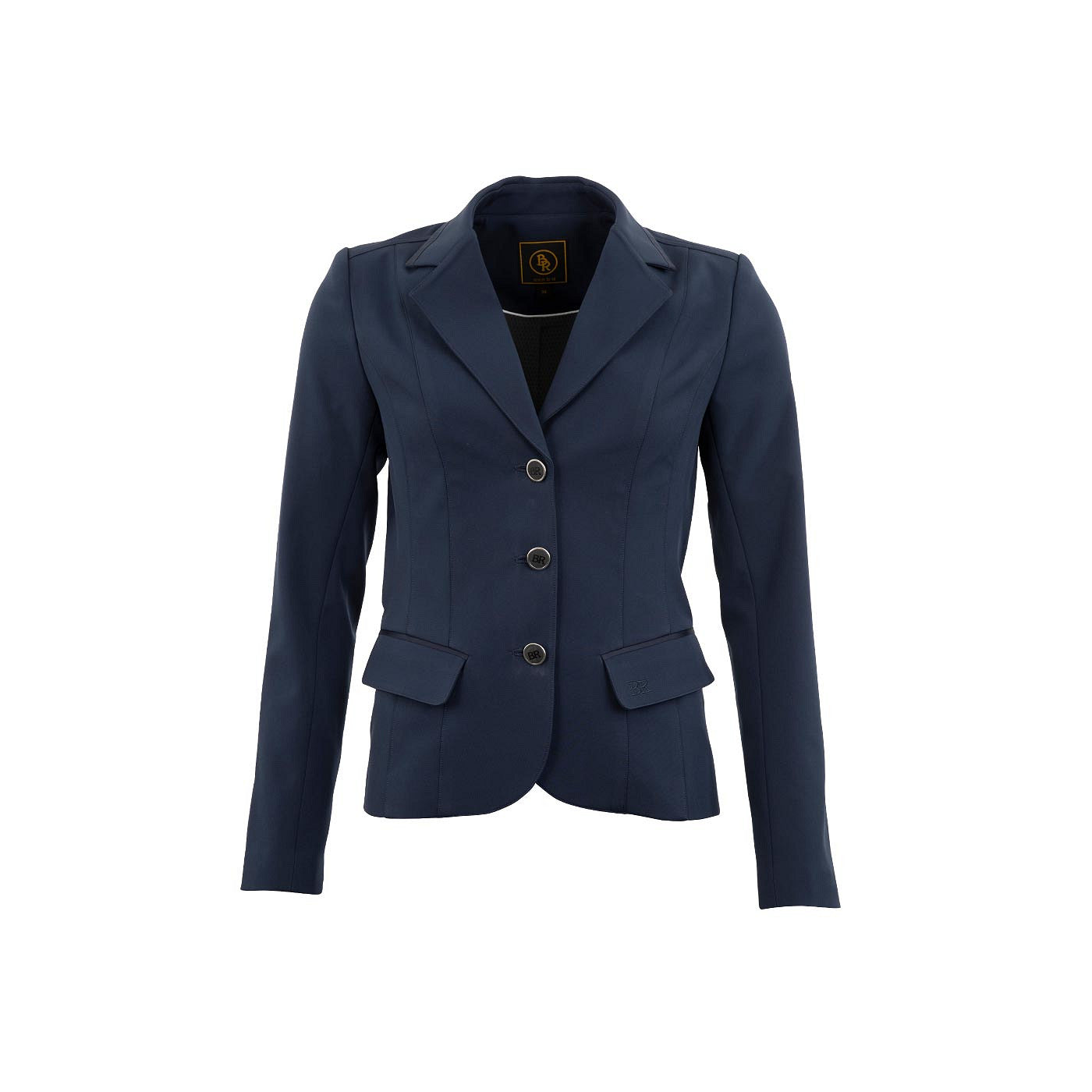 Auf der Vorderseite verfügt das Sakko über drei BR-Knöpfe aus Kunststoff. Die Manschetten sind mit den gleichen Knöpfen in einem kleineren Format versehen. Dieses Turniersakko hat zwei Klappentaschen vorne und zwei Reitschlitze hinten. Eine der Klappentaschen ist mit einem gestickten BR-Logo versehen und die Details aus Satin auf dem Kragen, den Klappentaschen und der Rückseite verleihen dem Sakko eine besondere Note. Der Schnitt des Sakkos betont die Taille und rundet es auf elegante Weise ab.
