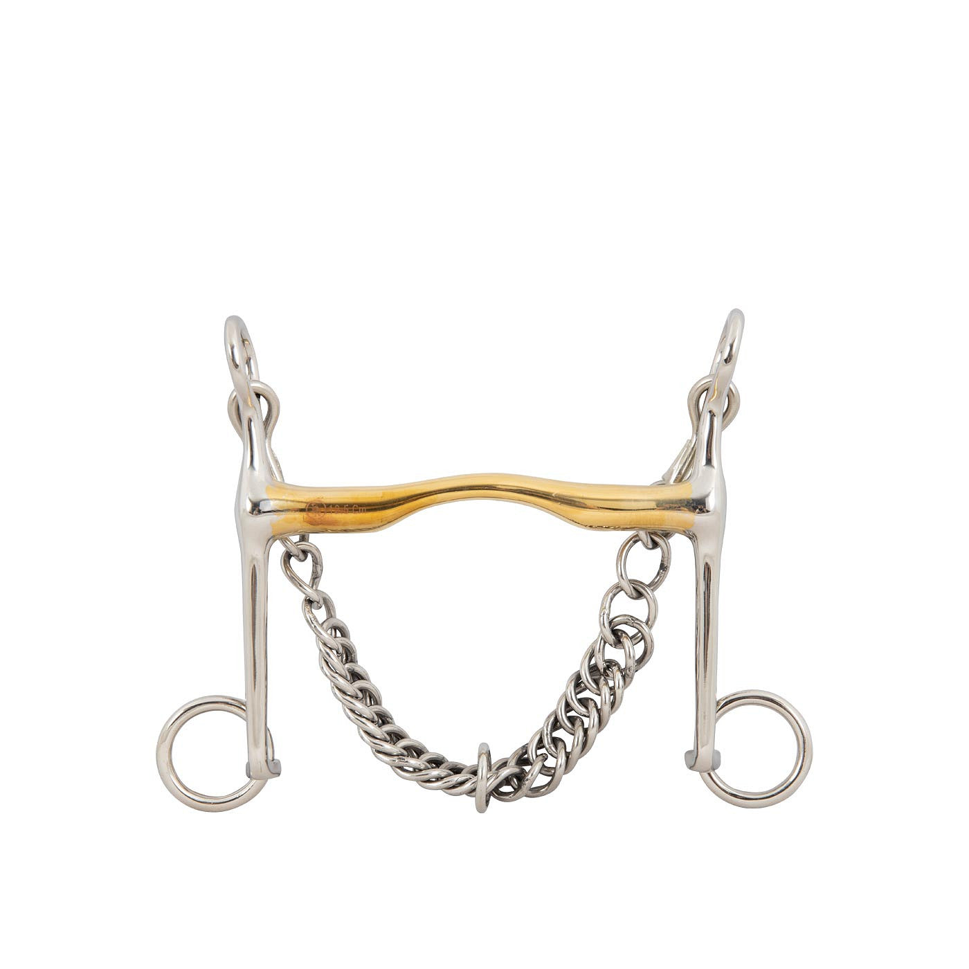 Diese qualitativ hochwertige Dressurkandare mit leichter Zungenfreiheit und starren Anzügen ist aus massivem Cuprigan mit Edelstahlschenkeln gefertigt. Cuprigan ist eine Legierung aus 89% Kupfer, 7% Aluminium, 3% Eisen und 1% Zink. Der Oxidationsprozess des Materials ergibt einen angenehmen Geruch und Geschmack. Die anatomische Form folgt der Form des Pferdemauls, was eine sanfte und gleichmäßige Druckverteilung ermöglicht. Die Kombination aus der Form und der einzigartigen Zusammensetzung von Cuprigan regt den Kauprozess und die Speichelbildung an, wodurch eine angenehme Verbindung mit dem empfindlichen Pferdemaul entstehen kann. Das Gebiss hat eine scharfe Wirkung auf das Maul. Das Mundstück ist 14 mm stark und die Schenkel haben eine Länge von 140 mm. Mit Kinnkette.