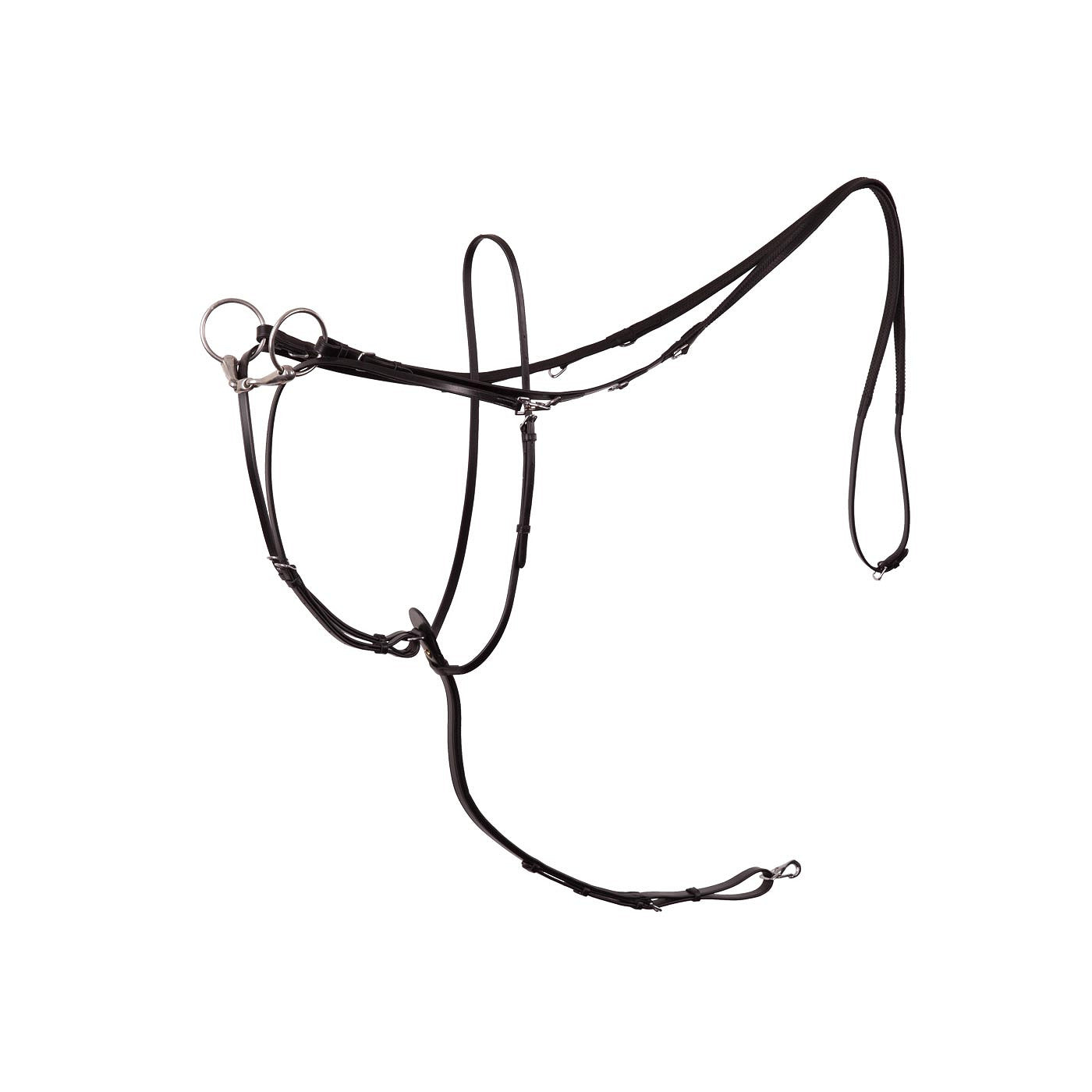 Thiedemann-Zügel aus Leder mit einem verstellbaren Halsriemen und einer verstellbaren Gurtschlaufe mit abnehmbarem Karabinerhaken zur Befestigung am Gurt. Die schmalen Riemen des Martingals sind ebenfalls verstellbar und mit Karabinerhaken versehen. Der Gummizügel (21 mm breit) hat Lederenden (15 mm breit) mit Schnallen. Dieser Zügel ist auf beiden Seiten mit drei D-Ringen ausgeführt: zwei auf den Lederenden und einem auf dem Gummiteil. Die schmalen Martingalriemen werden durch die Gebissringe gezogen und mit den Karabinerhaken an den D-Ringen des Zügels befestigt. Der Thiedemann-Zügel ist mit glänzenden silberfarbenen Beschlägen aus verchromtem Messing ausgerüstet. Ein Thiedemann-Zügel sorgt dafür, dass das Pferd beim Reiten den Kopf nicht zu weit nach oben oder nach vorne bewegen kann.