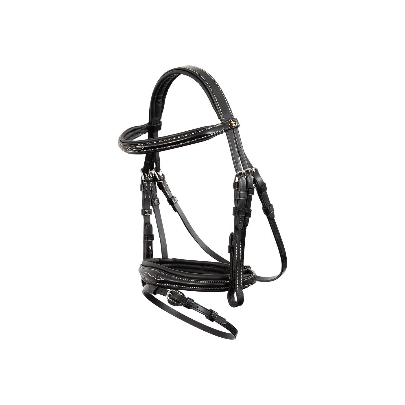 Der kombinierte Nasenriemen ist wunderbar weich gepolstert für optimalen Tragekomfort und ist mit einem Sperrriemen mit Schutzklappe an der Schnalle ausgestattet. Die Backenstücke enthalten verdeckte Verschlüsse für optimalen Komfort. Die cremefarbenen Ziernähte verleihen dem Zaumzeug einen verspielten Look.