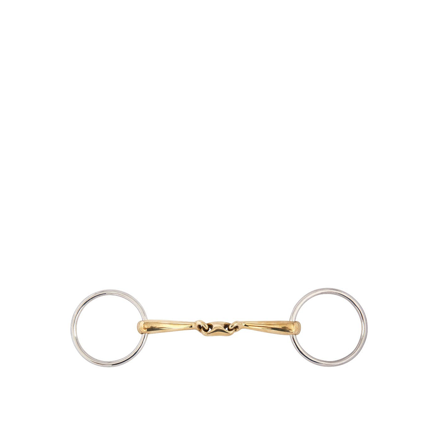Die Soft Contact Gebisse sind anatomisch geformt. Außerdem haben sie eine edle Ausstrahlung dank der goldenen Farbe des Mundstücks und vielleicht trifft es sogar den Geschmack Ihres Pferdes! Diese doppelt gebrochene Wassertrense ist aus massivem Cuprigan mit Edelstahlringen gefertigt. Cuprigan ist eine Legierung aus 89% Kupfer, 7% Aluminium, 3% Eisen und 1% Zink. Der Oxidationsprozess des Materials ergibt einen angenehmen Geruch und Geschmack. Die anatomische Form folgt der Form des Pferdemauls, was eine sanfte und gleichmäßige Druckverteilung ermöglicht. Die gebogene Form des Mundstücks ermöglicht ein bisschen mehr Raum für die Seitenpartien der Zunge. Die Kombination aus der Form und der einzigartigen Zusammensetzung von Cuprigan regt den Kauprozess und die Speichelbildung an, wodurch eine angenehme Verbindung mit dem empfindlichen Pferdemaul entstehen kann. Das Gebiss hat eine weiche Wirkung auf das Maul. Das Mundstück ist 14 mm stark und die Gebissringe haben einen Durchmesser von 65 mm. Eine Wassertrense ist ein Gebiss mit losen Gebissringen. Dieser Gebisstyp wird im Allgemeinen gut angenommen, weil das Mundstück relativ locker im Maul liegt. Bei einem doppelt gebrochenen Gebiss besteht das Mundstück aus drei Teilen. Der mittlere Teil des Mundstücks liegt flach auf der Zunge. Dadurch entsteht mehr Druck auf die Zunge als bei einem einfach gebrochenen Mundstück. Je stärker das Mittelstück ist, desto mehr Druck wird auf die Zunge ausgeübt.
