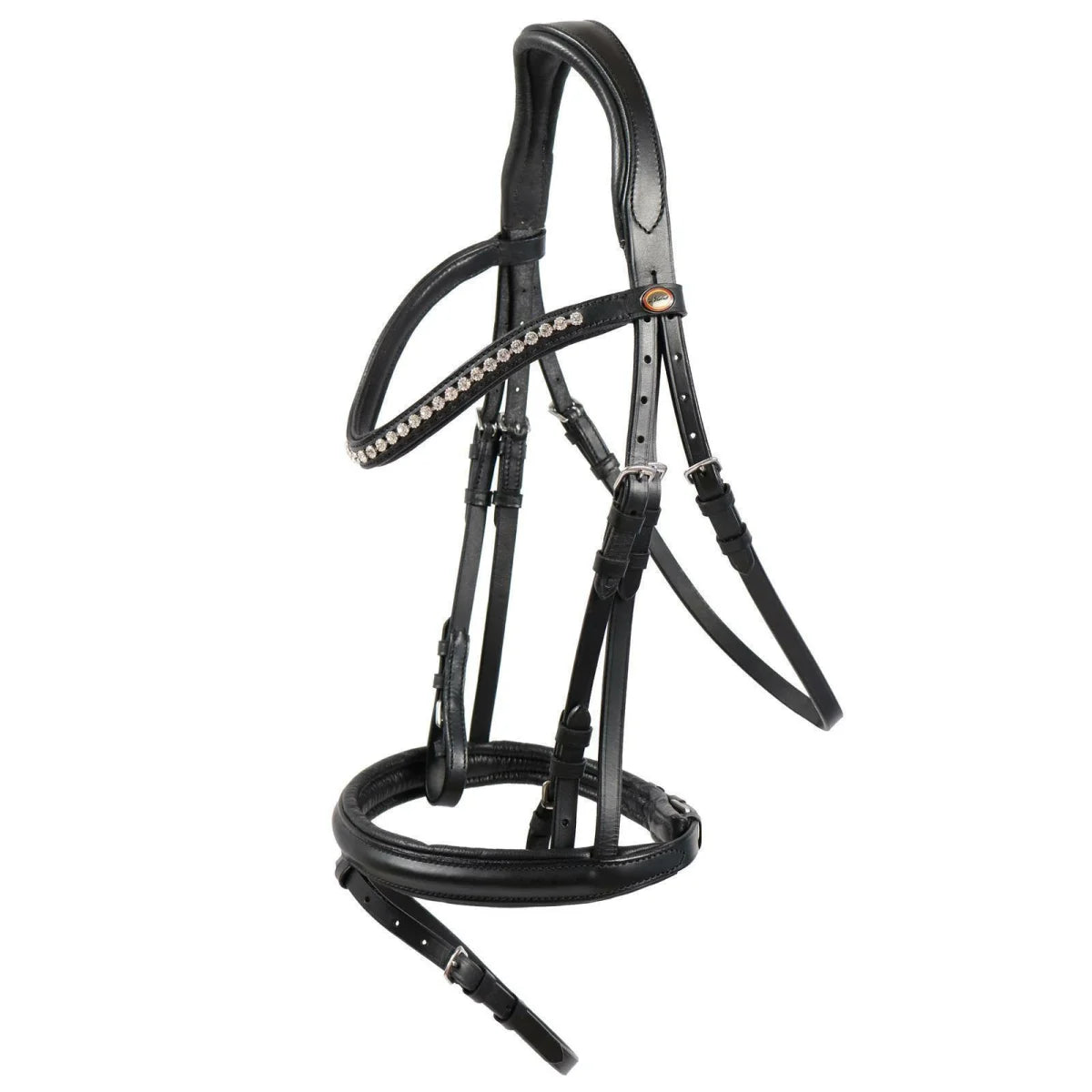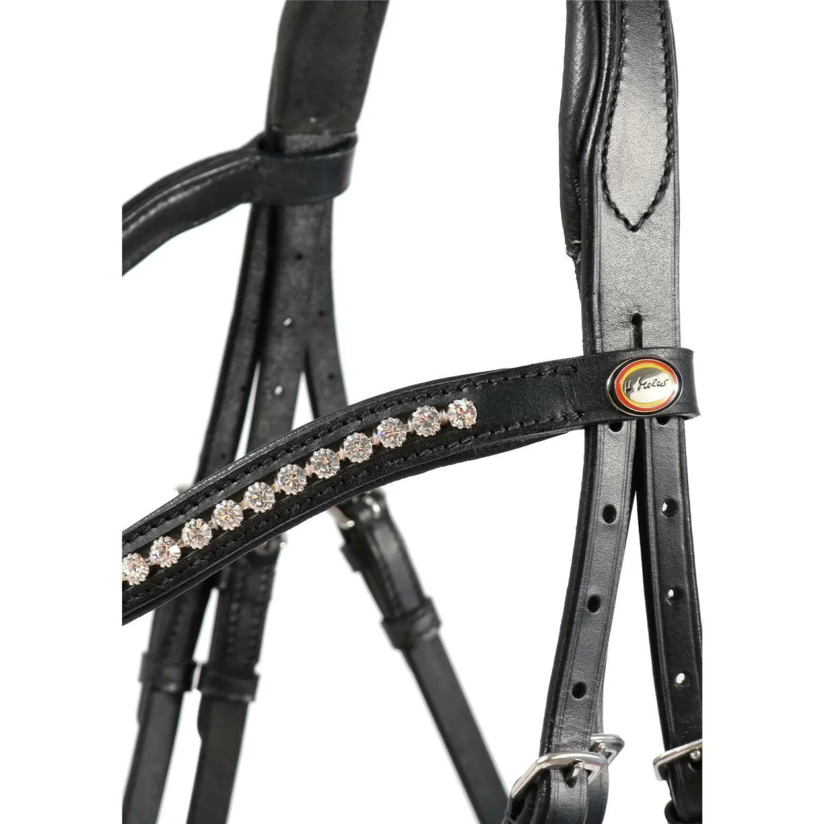 Die Trense Valluhn ist vielseitig einsetzbar. Das englisch-kombinierte Reithalfter gibt es in den Farben Schwarz/Silber. Der Stirnriemen ist verziert mit Kristall-Strass-Steinen in Diamantfarben. Darüber hinaus überzeugt die Pferde Trense mit einem fairen Preis-Leistungs-Verhältnis.