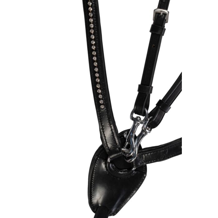 Das Vorderzeug Dana ist das neue Must-Have für alle Springreiter sowie Pferdesportler, die gerne mit einem Vorderzeug reiten. Es ist aus langlebigem Qualitätsleder gefertigt und mit feinen Deko-Steinen besetzt, die für ein glamouröses Erscheinungsbild von Pferd und Reiter sorgen. Die Martingalgabel kann bei Bedarf schnell und einfach abgenommen werden und auch die Befestigung am Sattel erfolgt unkompliziert durch Karabinerhaken. Das Vorderzeug im klassischen Schwarz ist an verschiedenen Stellen individuell einstellbar und in unterschiedlichen Größen erhältlich, sodass Ponys, Vollblüter und Warmblüter damit ausgestattet werden können. Für einen optimalen Komfort ist Dana an den Druckpunkten weich gepolstert.
